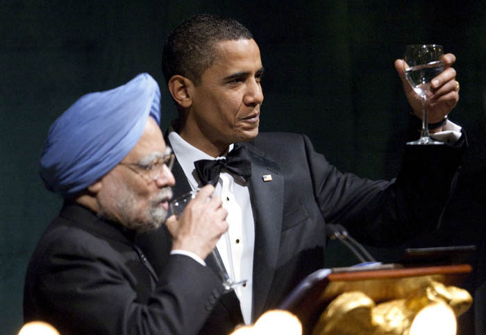 पंतप्रधान नक्की काय (ग्लासातून) घेत आहेत हे माहीत नाही आणि तसे त्यांनी अगदी माझी परवानगी विचारली तरी हवे ते घ्या असेच म्हणेन... ;) पण खालील फोटोत मात्र अमेरिकन राष्ट्रपतींच्या हातात पाण्याचा ग्लास नाही हे समजते..